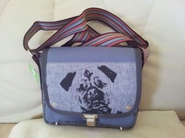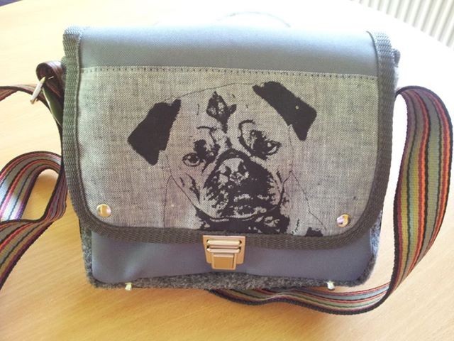 Diese Tasche ist ein echter Hingucker aus grauem Rasenteppich, handgefertigtem Siebdruck mit einem Mops-Portrait auf Leinenstoff und bietet Platz für allerhand Kleinutensilien.