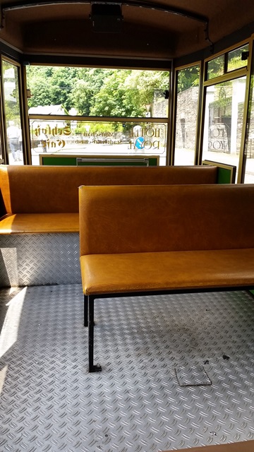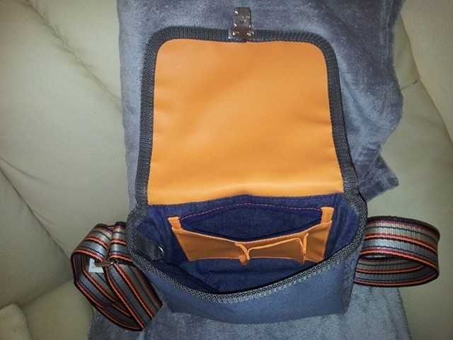 Innen ist die Tasche mit orangefarbenem Leder ausgekleidet, es befindet sich eine verschließbare Innentasche, Handytasche und einen