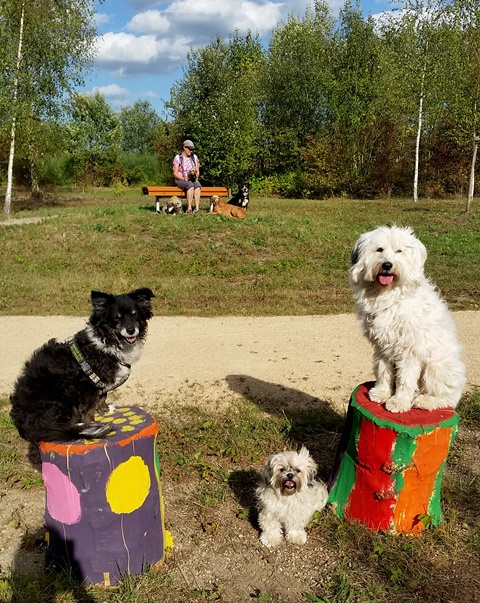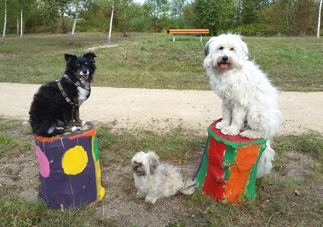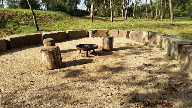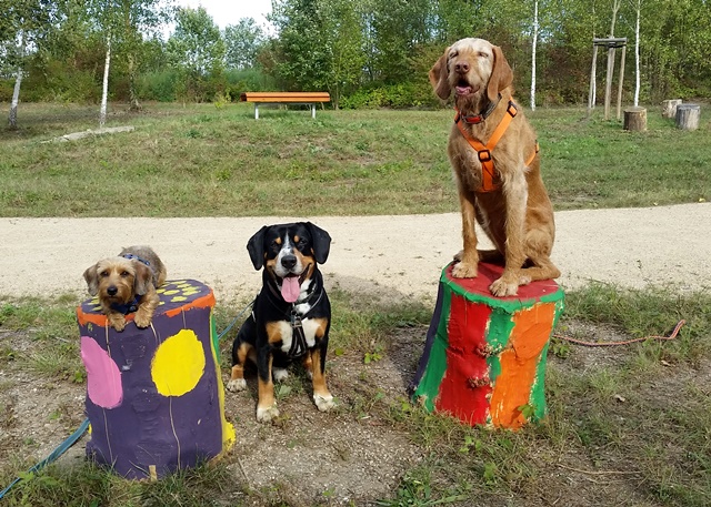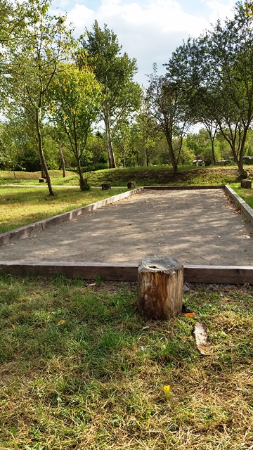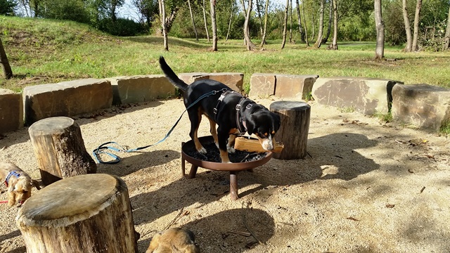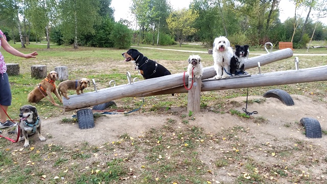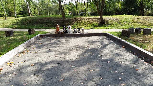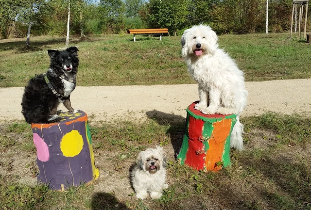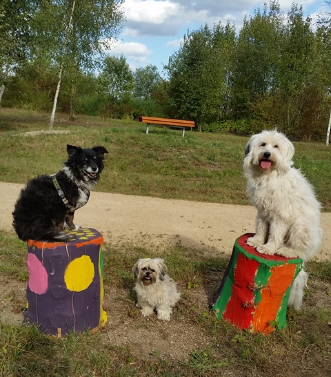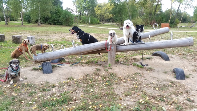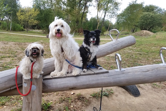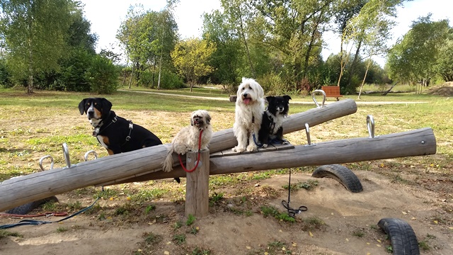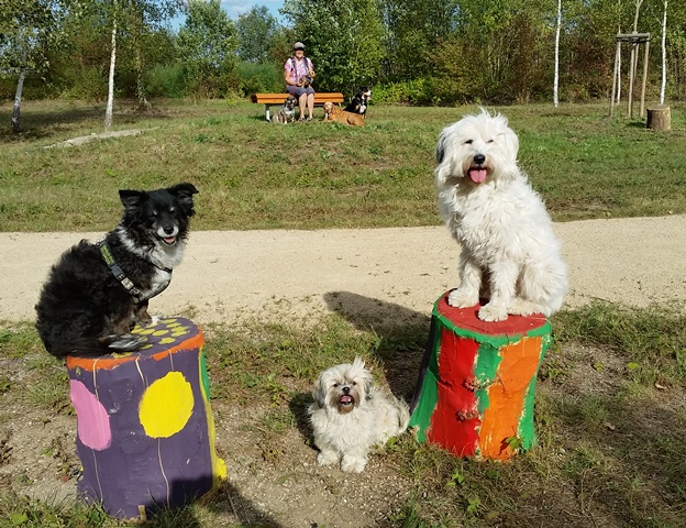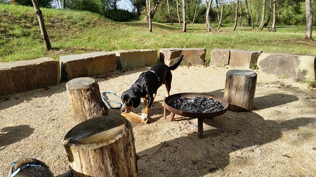 Weiter geht es zu den Holzliegen die zum Sonnenbaden einladen und den Blick auf die Boulebahn lenkt wo man ein paar Kugeln rollen lassen kann. Wir schlendern entlag des Barfußpfades und sind erstaunt wieviel Sitzgelegenheiten sich auf dem Gelände verteilen. Neben Tischen und Bänken kann man auf Baumstämmen und großen Felsbrocken unter anderem am Lagerfeuer beisammen sitzen und klönen. Natürlich haben auch unsere Hunde Spaß auf die großen Steinen und Baumstämmen zu hüpfen und die Aussicht mal aus einer anderen Perspektive zu erkunden. Eine gute Idee sind die Fitnessgeräte für Erwachsene und die Kreuzwippe für jeden ist was dabei. Wir Zweibeiner und unsere Hunde hatten viel Spaß das schön angelegte Gelände zu erkunden und ein Cafe würde das Ganze noch abrunden. Auf jeden Fall kommen wir wieder und werden es weiterempfehlen.